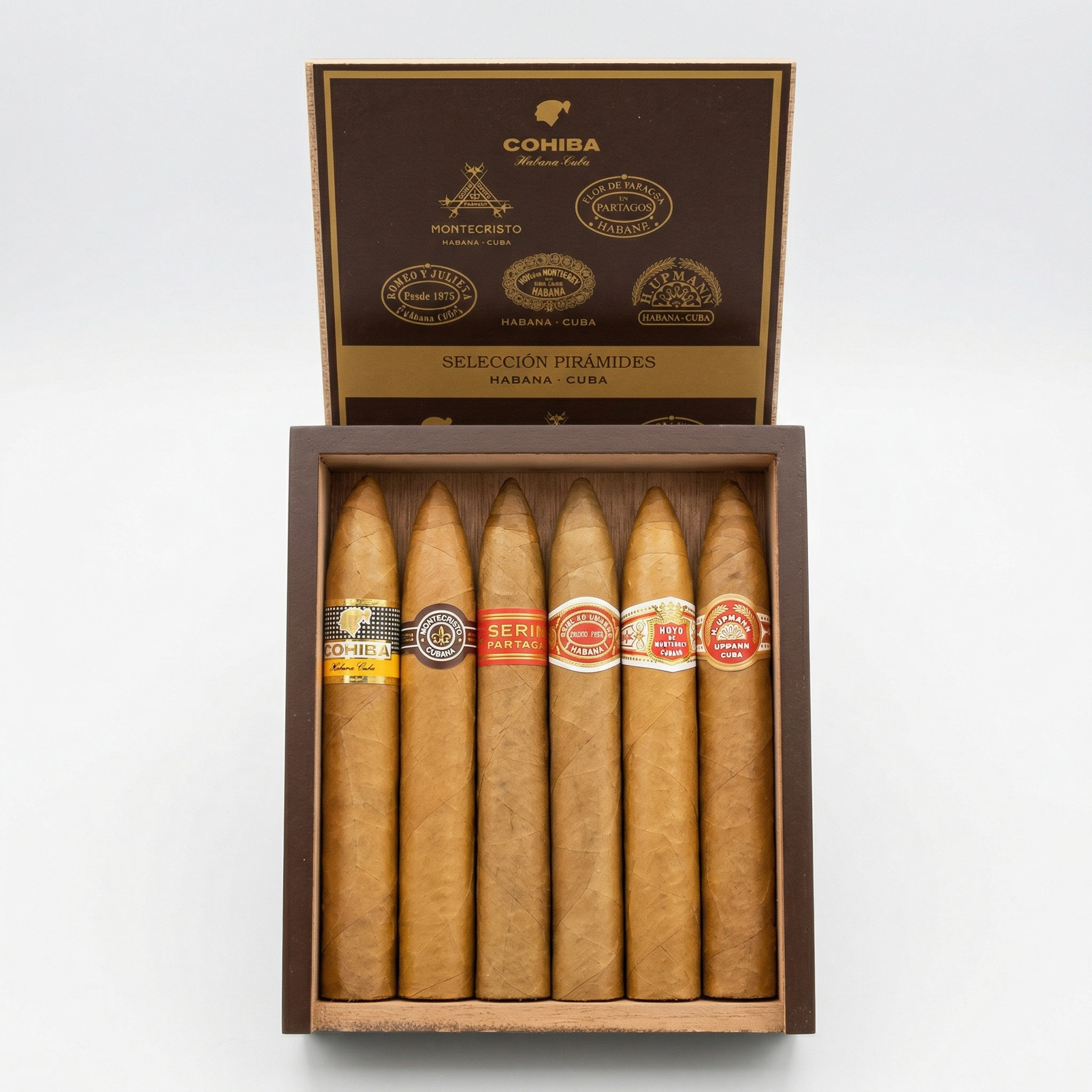 Presented in a dark wood gift box featuring the six brand medallions on the inner lid and sealed with the official Habanos ribbon, the Selección Pirámides is an extraordinary gift for birthdays, anniversaries, or any occasion worthy of celebration.